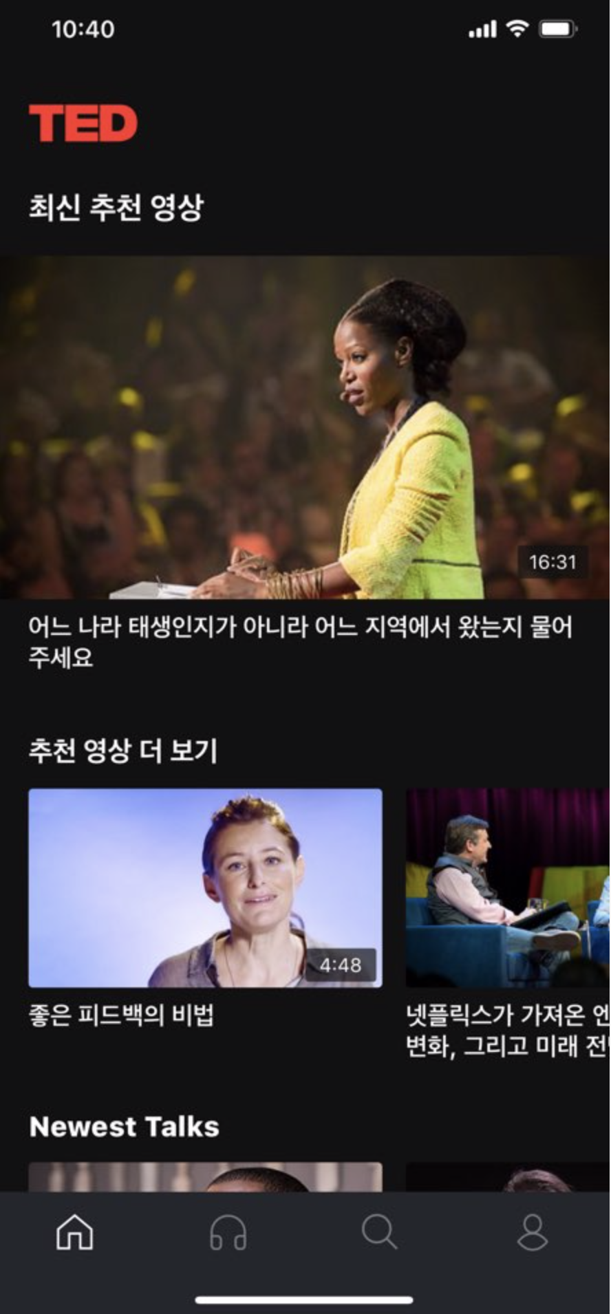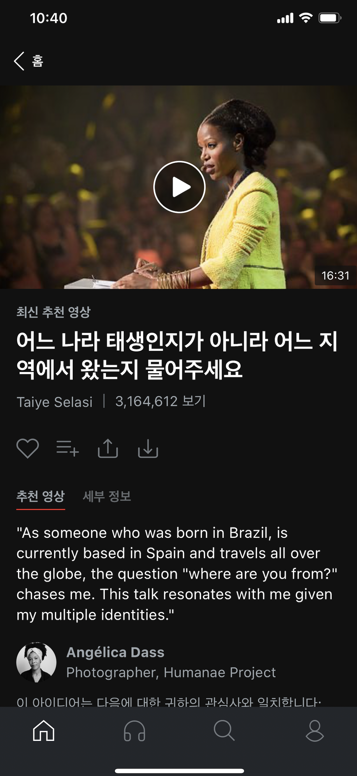TED 앱을 플레이스토어나 앱스토어에서 설치해서 어디서나 이동하면서 편리하게 영상을 시청할 수 있습니다. 가로 보기, 자막 설정 모두 가능하고요~!