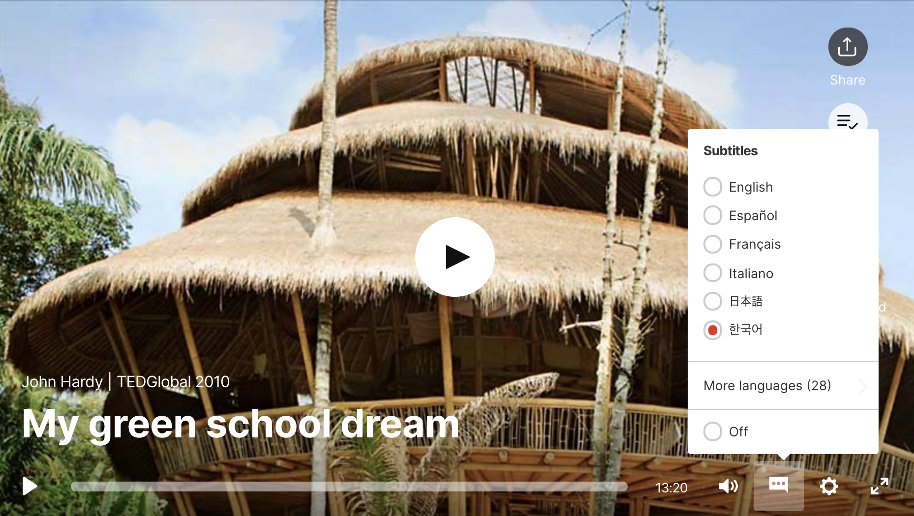 영상은 보통 영어로 보라고 하지만, 저는 한글로 먼저 보는 것을 추천합니다. TED 자체의 내용이 워낙 좋기도 하고 내용을 먼저 이해해야 말이 들린다고 생각하기 때문입니다. 한글로 먼저 강연의 취지를 제대로 시청하고, 다시 영어를 자막으로 놓고 들으시면 됩니다.