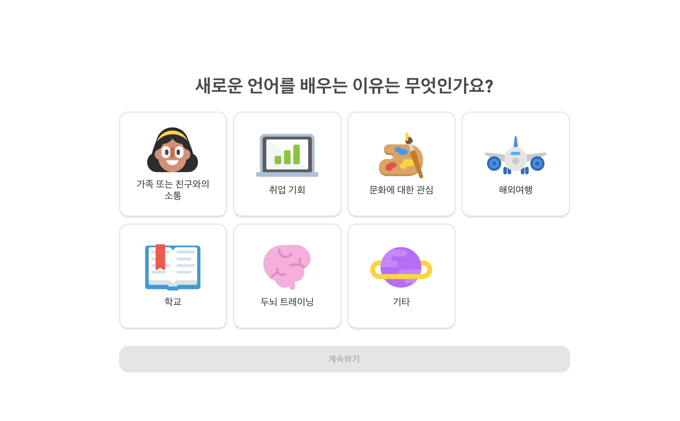 2. 언어 설정까지 마쳤다면 언어를 배우고 싶은 이유를 하나 선택해주세요.
