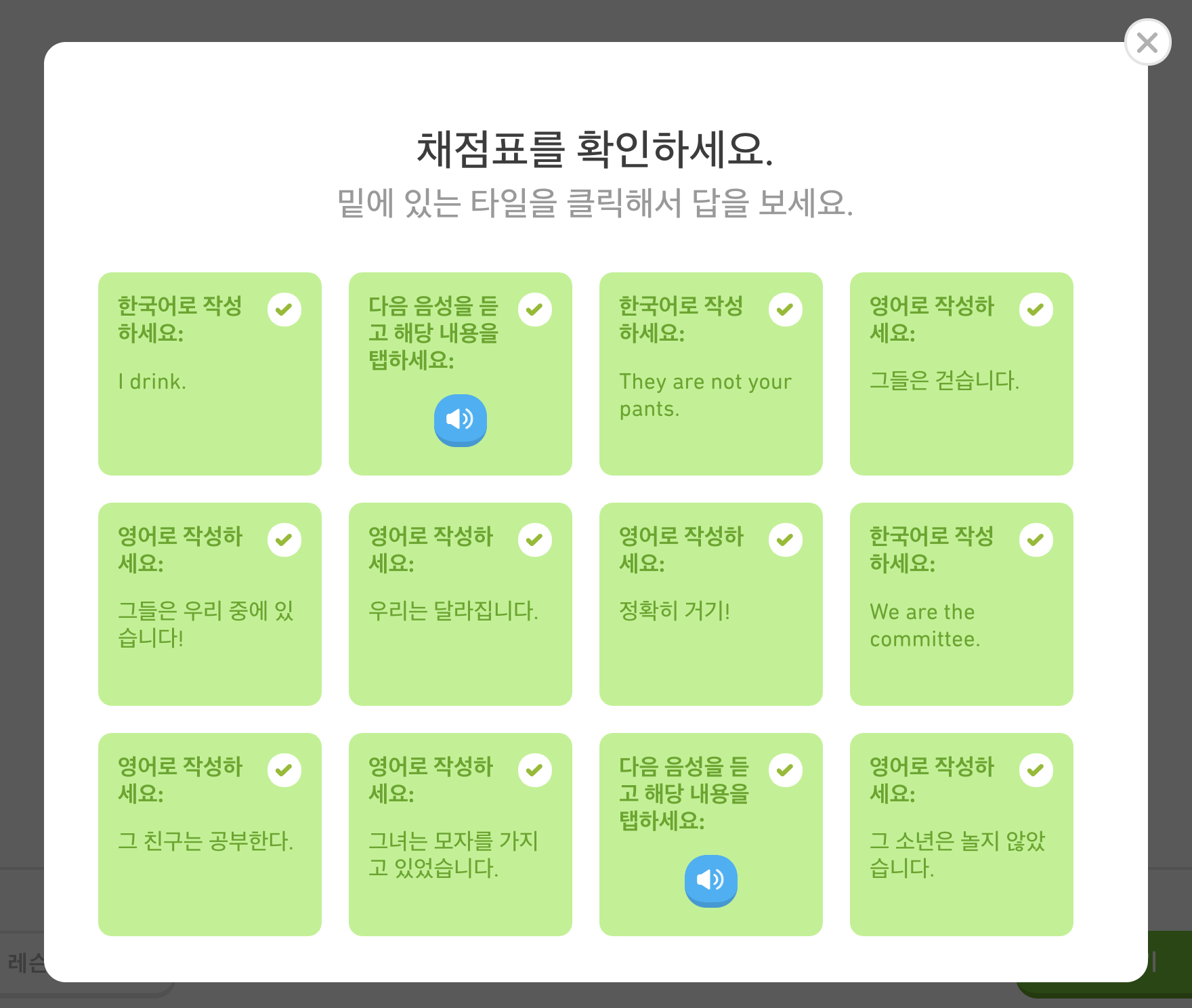 듀오링고 시험 채점표로 내가 틀린 항목을 다시 확인해볼 수 있어요
