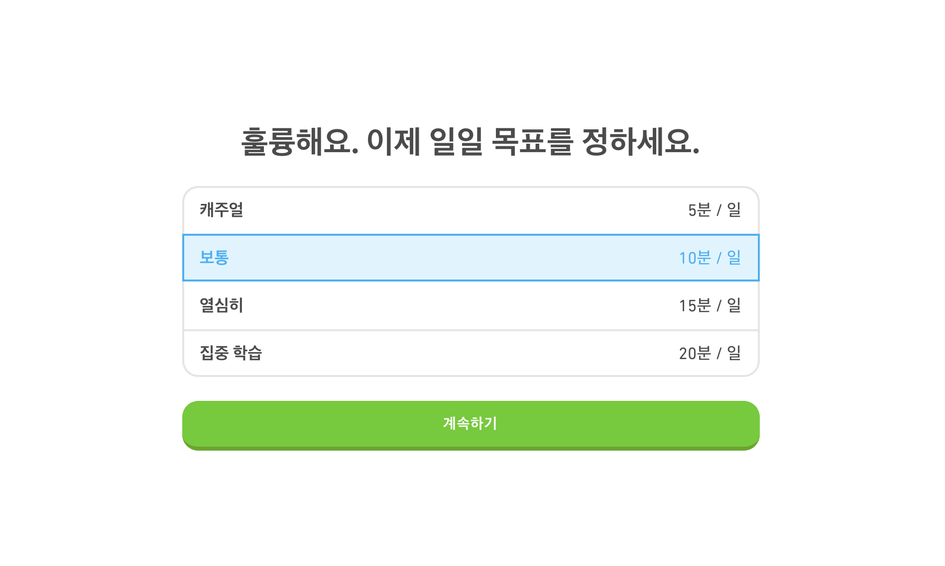 3. 일일 목표는 5분, 10분, 15분, 20분에서 각자 매일 할 수 있는 만큼만 선택하세요~ 나중에 설정은 또 변경할 수 있으니 10분부터 시작하면 좋아요!