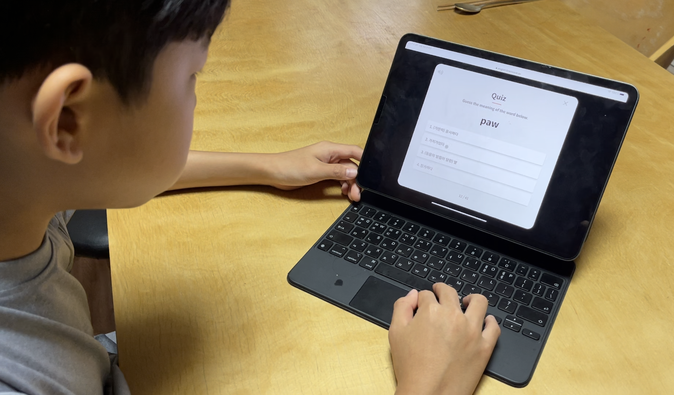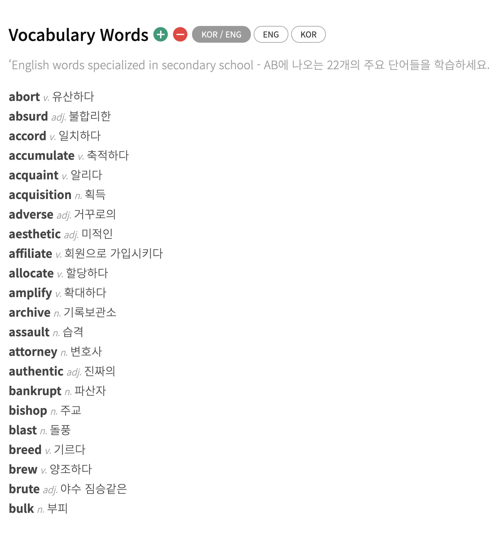 단어들은 50여 개씩 나누어 A~Z순으로 온라인 교재로 만들었습니다. 단어 퀴즈를 통해 외울 수 있도록 하며, 중요한 것은 긴 시간 공부하는 것이 아니라 반복하는 것입니다.
