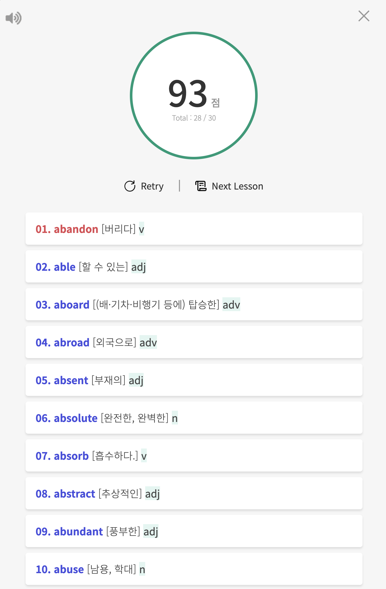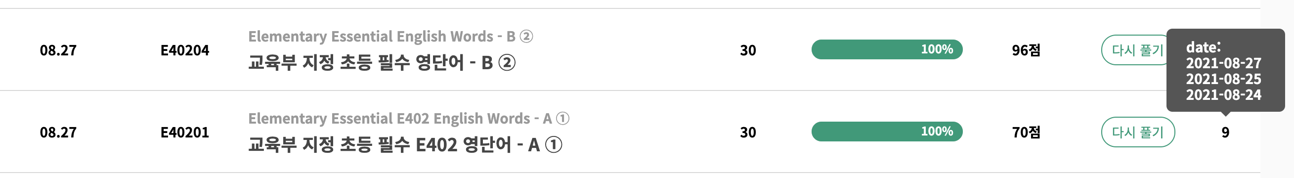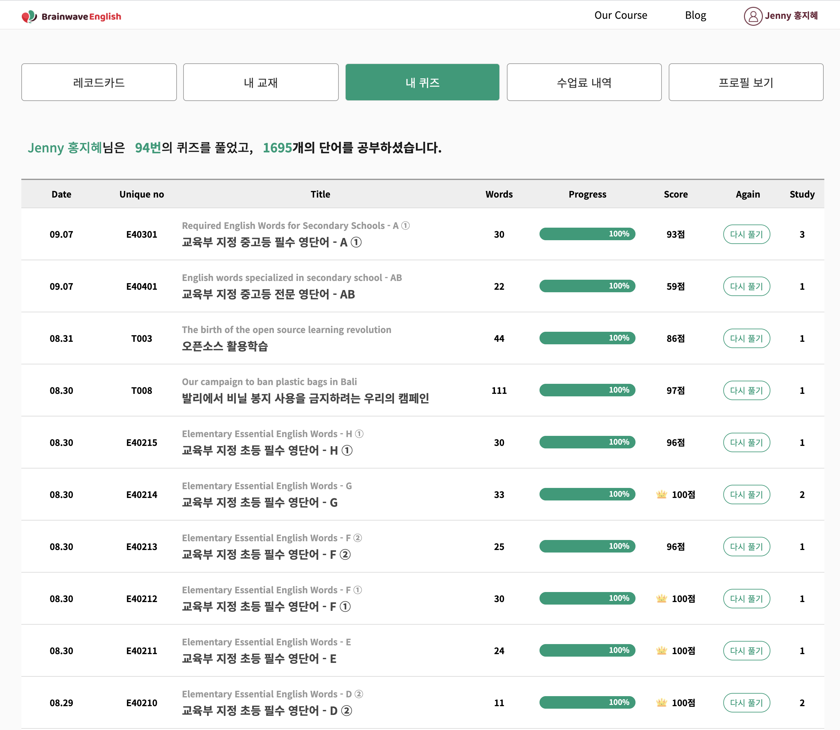 단어 시험 기록은 내 학습 기록에 누적됩니다. 틀렸던 단어들은 다시 풀어 볼 수 있으며, 영어 단어 퀴즈는 확신이 들 때까지 무한 반복할 수 있습니다. 눈으로만 외우셔도 충분하며 계속 진도는 나가면서 텀을 두고 두세 달에 한 번씩 되풀이를 해보세요!