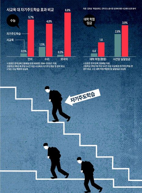 2.'사교육이 가장 집중된 수학 과목을 예로 들면, 고3 때 주당 사교육 시간이 1시간 많을 때 수능 수학 성적(백분위 기준)은 평균 1.5%포인트 상승한 반면, 혼자 1시간 더 공부하면 4.6%포인트까지 올랐다. 자기주도학습이 사교육보다 3배가량 효과가 더 좋았다'