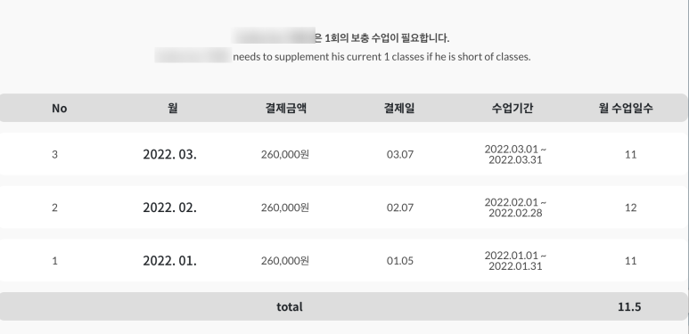 결제일 전에 월말 학습 리포트가 발송되며, 부모님들이 학습 내용과 학생의 학습 태도, 학습 일수 등을 확인할 수 있습니다. 결제일과 수업 일수 기록은 자동으로 학생의 마이페이지에서도 확인할 수 있습니다. 부족한 수업일수는 학생과 상의하여, 가능한 날짜에 보충 수업을 실시합니다.