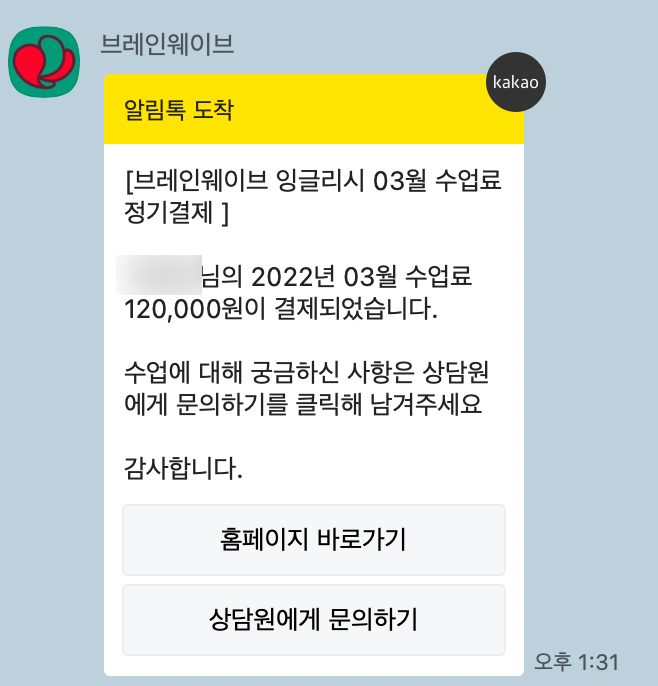 여기까지가 정기결제 등록에 관련된 프로세스입니다. 이처럼 매우 간단하게 등록이 가능합니다. 등록과 함께 첫 달 수업료가 결제되고, 이후 월 정기 결제는 정해진 날짜 (매달 5일, 휴일 시 익일)에 결제가 진행되며, 결제 통보는 실시간으로 알림톡으로 학생 또는 학부모님께 전달됩니다.