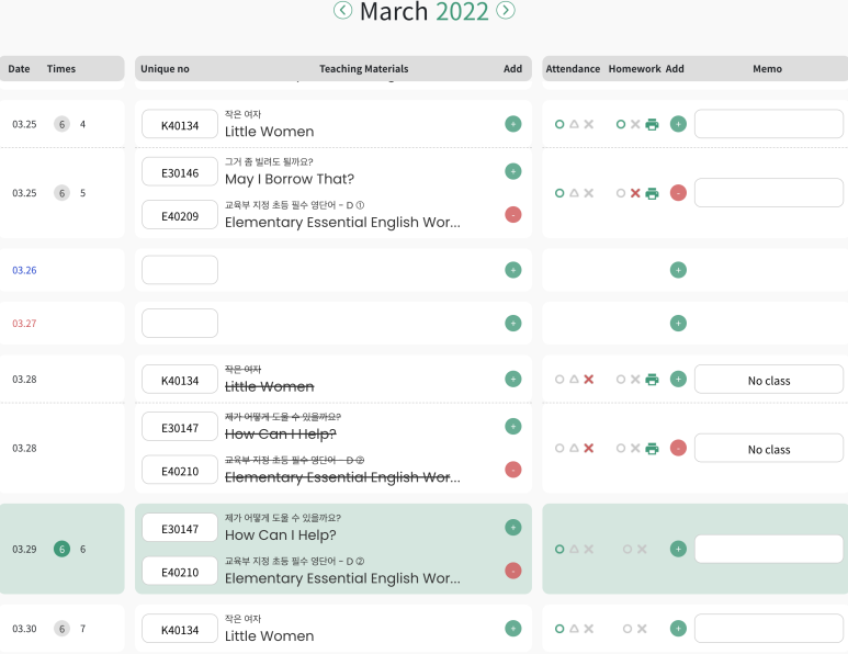 선생님이 학생의 레코드 카드에 출석, 휴강을 표시합니다.