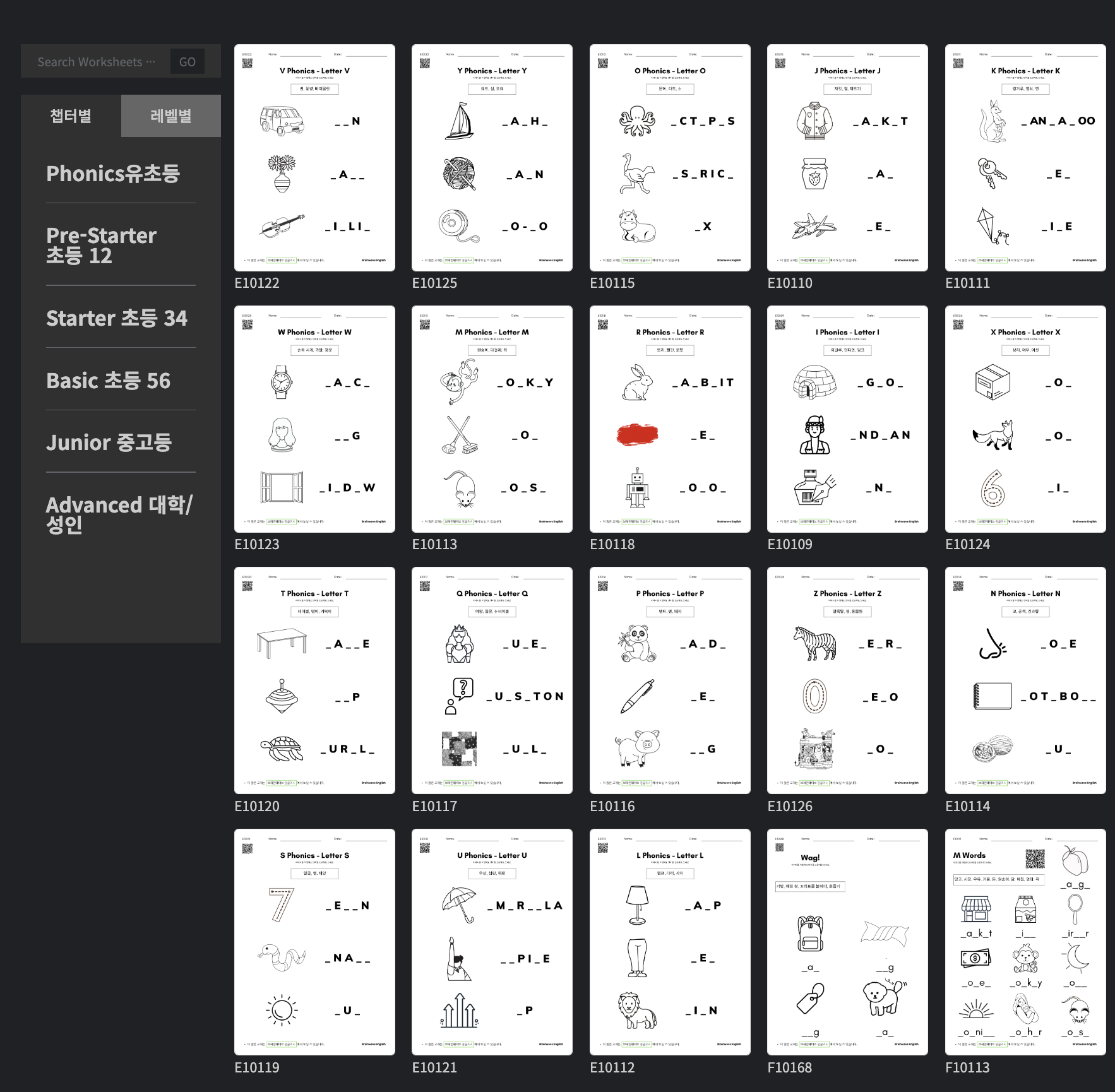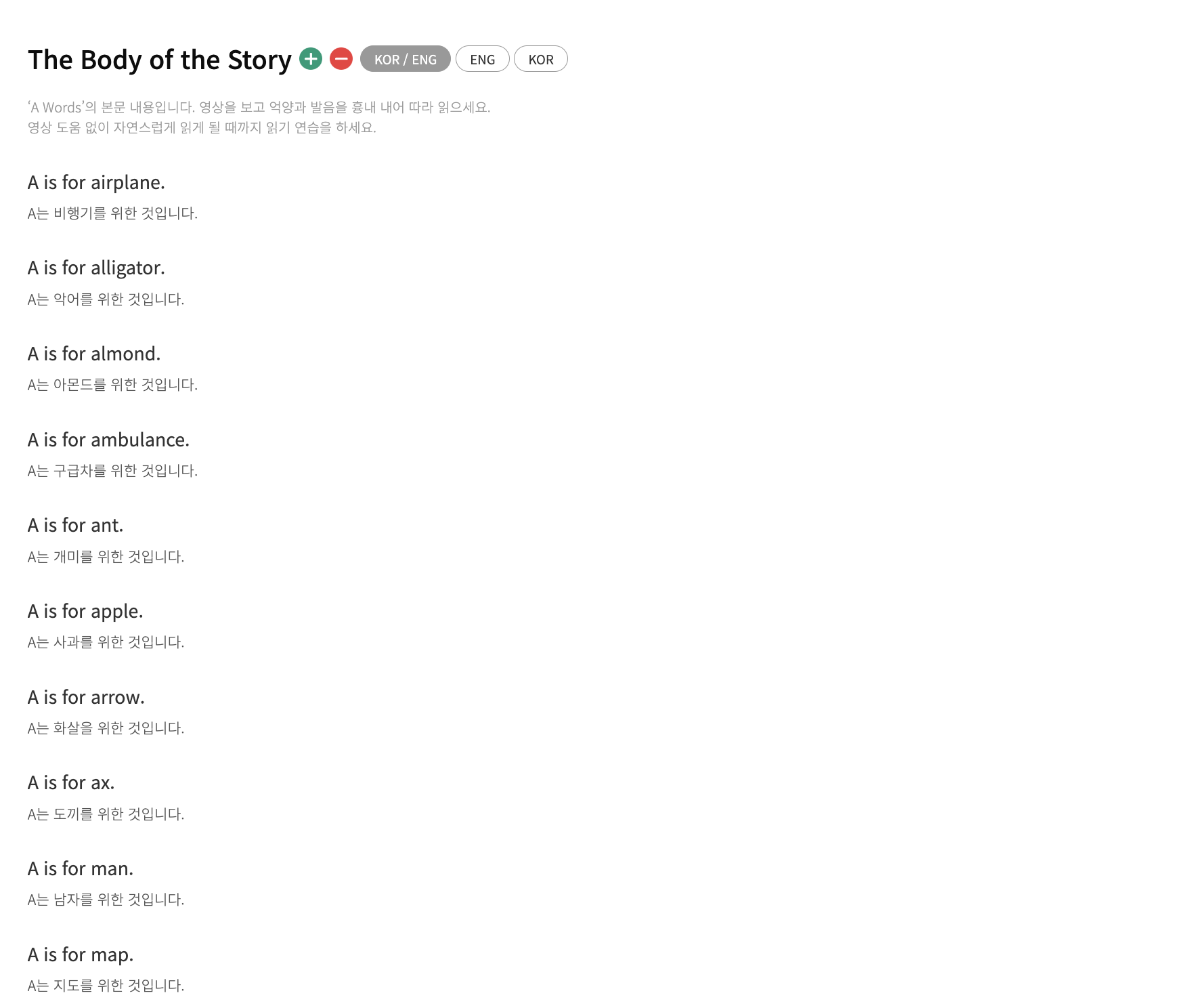 A부터 Z까지 각 알파벳들의 발음은 물론, 단어들까지 단계별로 심화된 문장과 함께 공부할 수 있습니다.